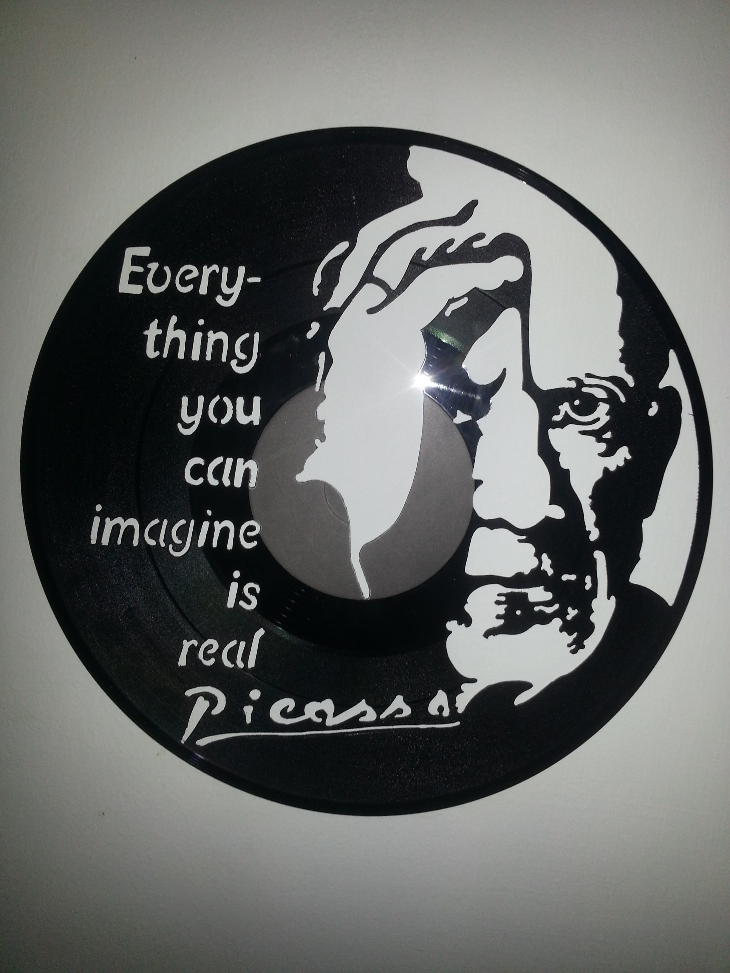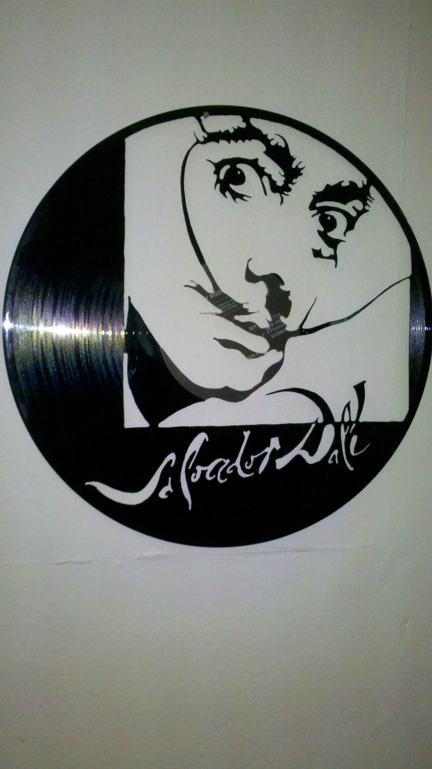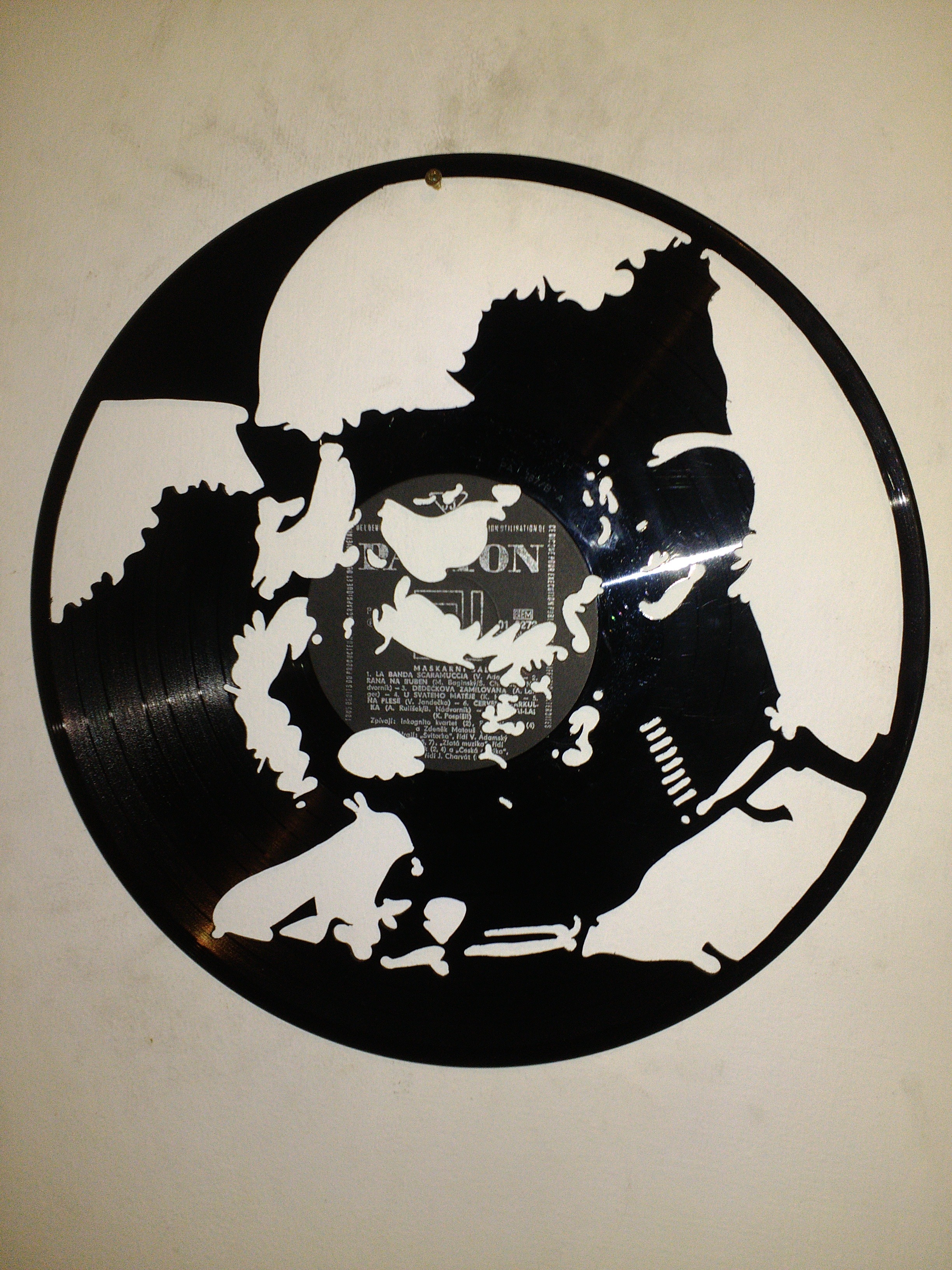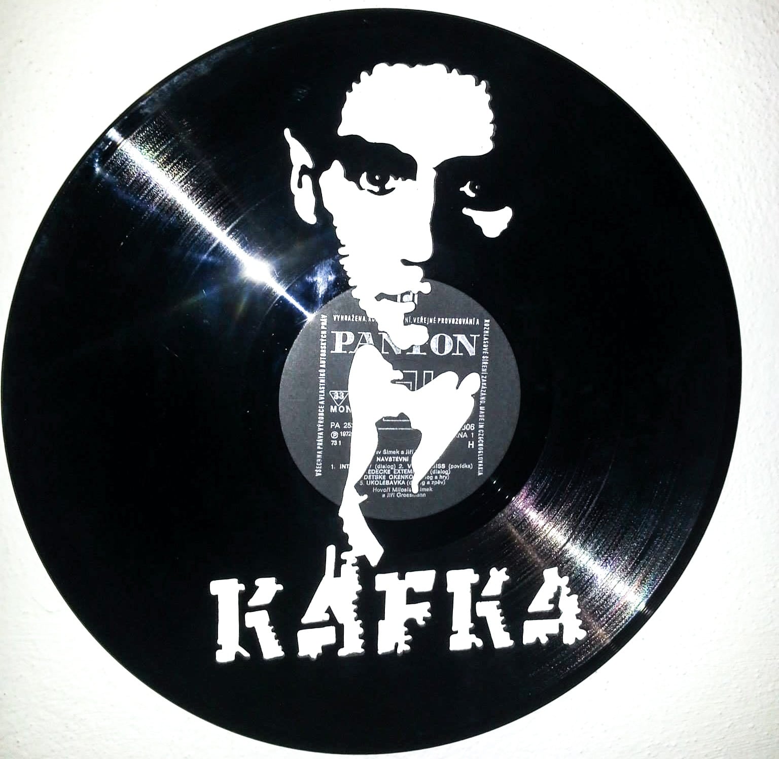 Zajímavější je ale instalace, kdy se deska pověsí na silon do prostoru před zeď a nasvítí se zepředu zdrojem ostrého světla. Najednou jsou objekty dva. Samotná deska v prostoru a její zvětšená projekce na zdi za ní.